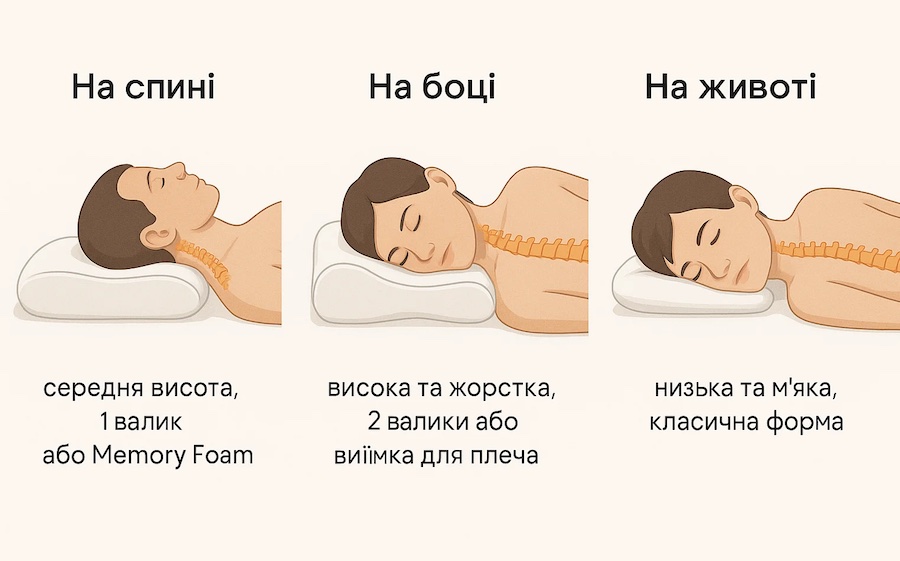Висота подушки залежить від ширини плечей: для широких – 12-15 см, для вузьких – 8-10 см. Поза сну визначає форму: на боці потрібна вища опора, на спині – нижча. Жорсткість матраца впливає: на м’якому обирайте нижчу подушку, аби уникнути провисання. Тестуйте в магазині, лежачи кілька хвилин.