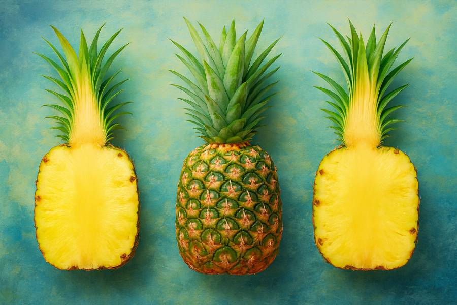 Не всі ананаси однакові — сорти диктують смак і вибір. Smooth Cayenne, 70% ринку, великий, соковитий, з класичним балансом кисло-солодкого. Золота шкірка в основі, м’якоть жовта. Queen Victoria — компактний, солодший, без кислинки, ідеал для новачків, з рожевими нотками.