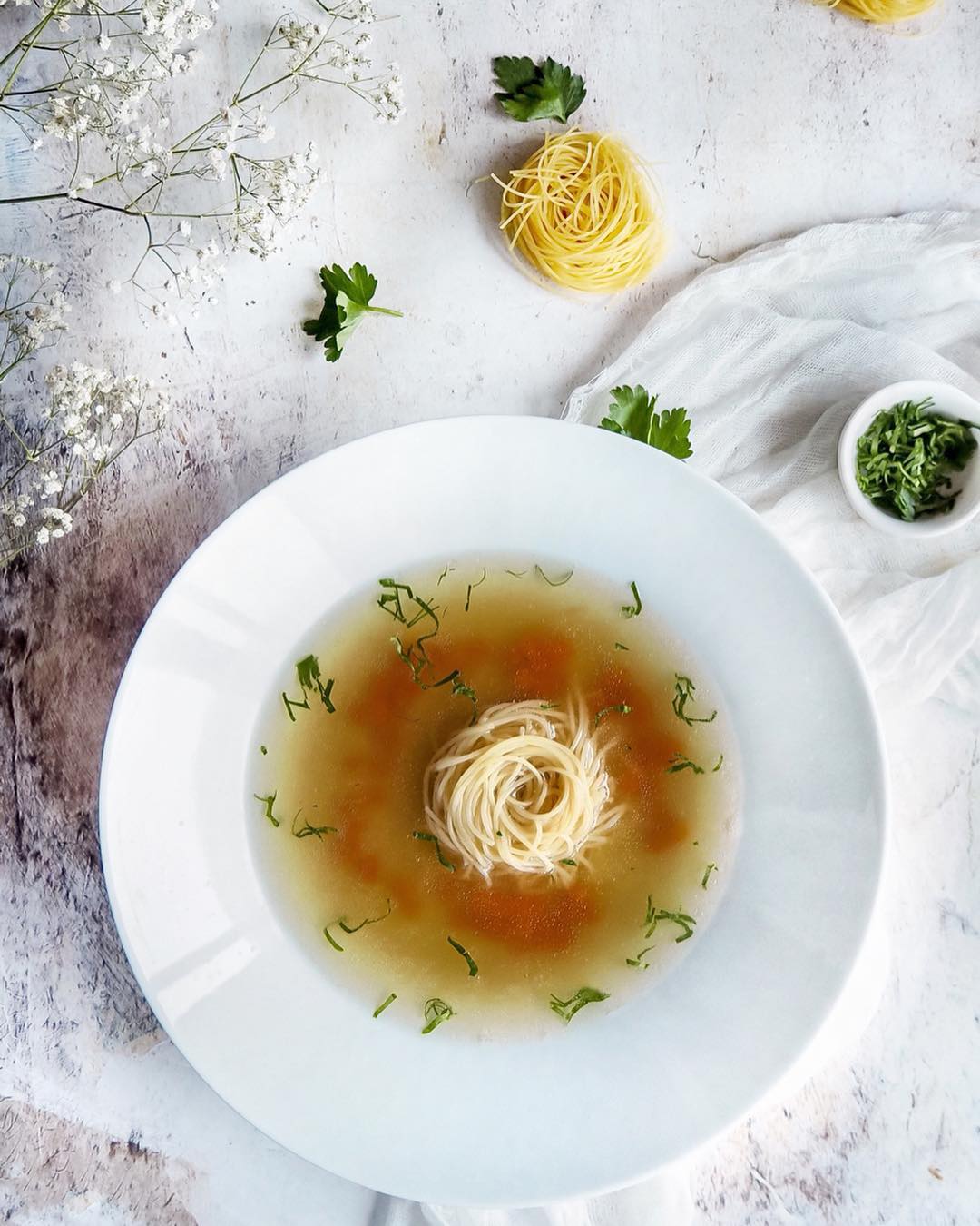 Подавайте в білій порцеляні, посипте петрушкою. Температура 70°C – гаряче, але не обпікає. Таке поєднання підкреслює чистоту бульйону, ніби симфонія в тарілці.