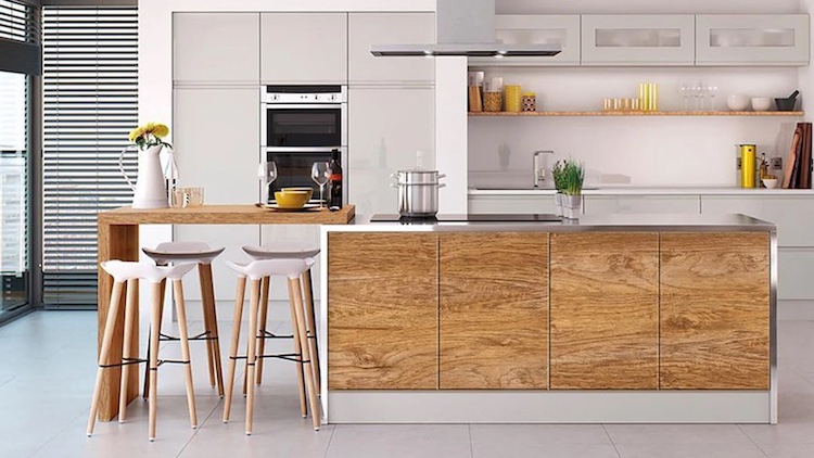 - Применение открытых полок вместо верхних навесных модулей, что добавляет интерьеру воздуха и снижает затраты.