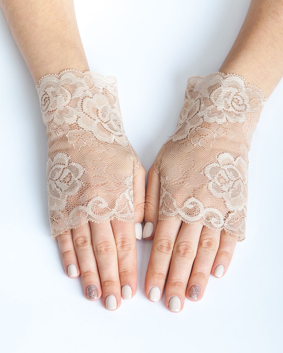 3. Вечірній: чорна сукня + мереживні до ліктя + підбори. Браслети зверху — для акценту.