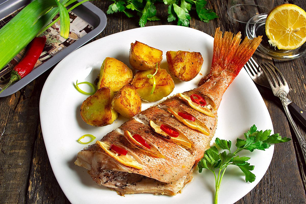 Морський окунь, або європейський лаврак, мешкає в Атлантиці та Середземному морі, де набирає солодкуватого смаку від планктону. Його біле філе з низьким вмістом кісток легко відокремлюється, а природна жирність робить м’ясо соковитим без зайвих калорій. За даними сайту foodstruct.com, 100 грамів сирої риби містить 124 ккал, 22,7 г білка та лише 2,6 г жиру, здебільшого корисних омега-3 кислот.