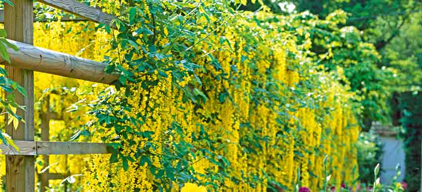 Клематис ‘Jackmanii’ цвіте пурпуровими дзвіночками все літо. Сонце для квітів, ноги в тіні — мульчуйте торфом. Гліцинія китайська каскадом роняє блакитні китиці, але вага лози — до 20 кг/м, укріплюйте паркан. Обрізка двічі, родючий грунт.