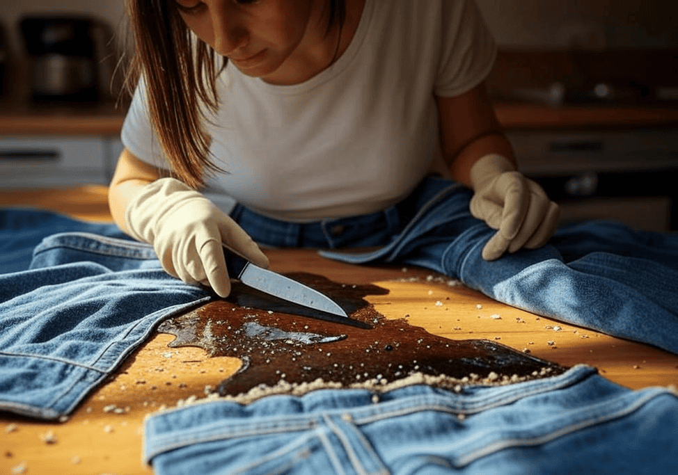 Джинси: сода + господарське мило 72%, замочіть у гарячій воді з оцтом (1:10) на 2 години. Робочий одяг: уайт-спірит, бо витримає.