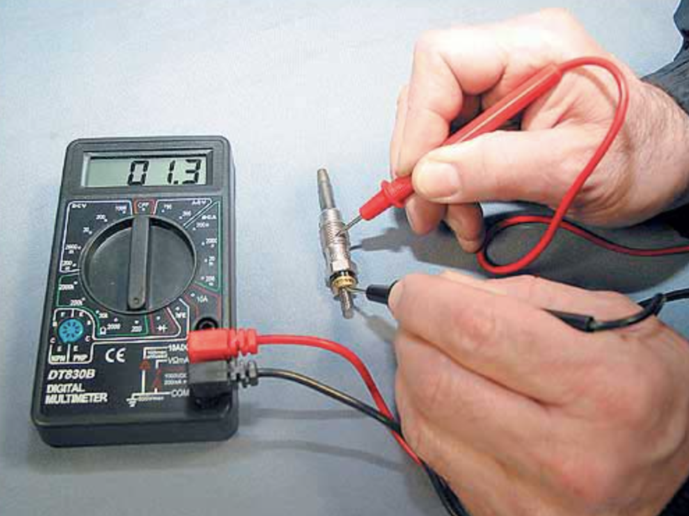 Крок 1: Вимір опору мультиметром. Від’єднайте фішку, червоний щуп на наконечник, чорний – на корпус або масу двигуна. Норма: 0,5–2 Ом (Bosch Duraterm – 0,6–1,2 Ом). Більше 5 Ом – обрив спіралі. 0 Ом – пробій на масу.