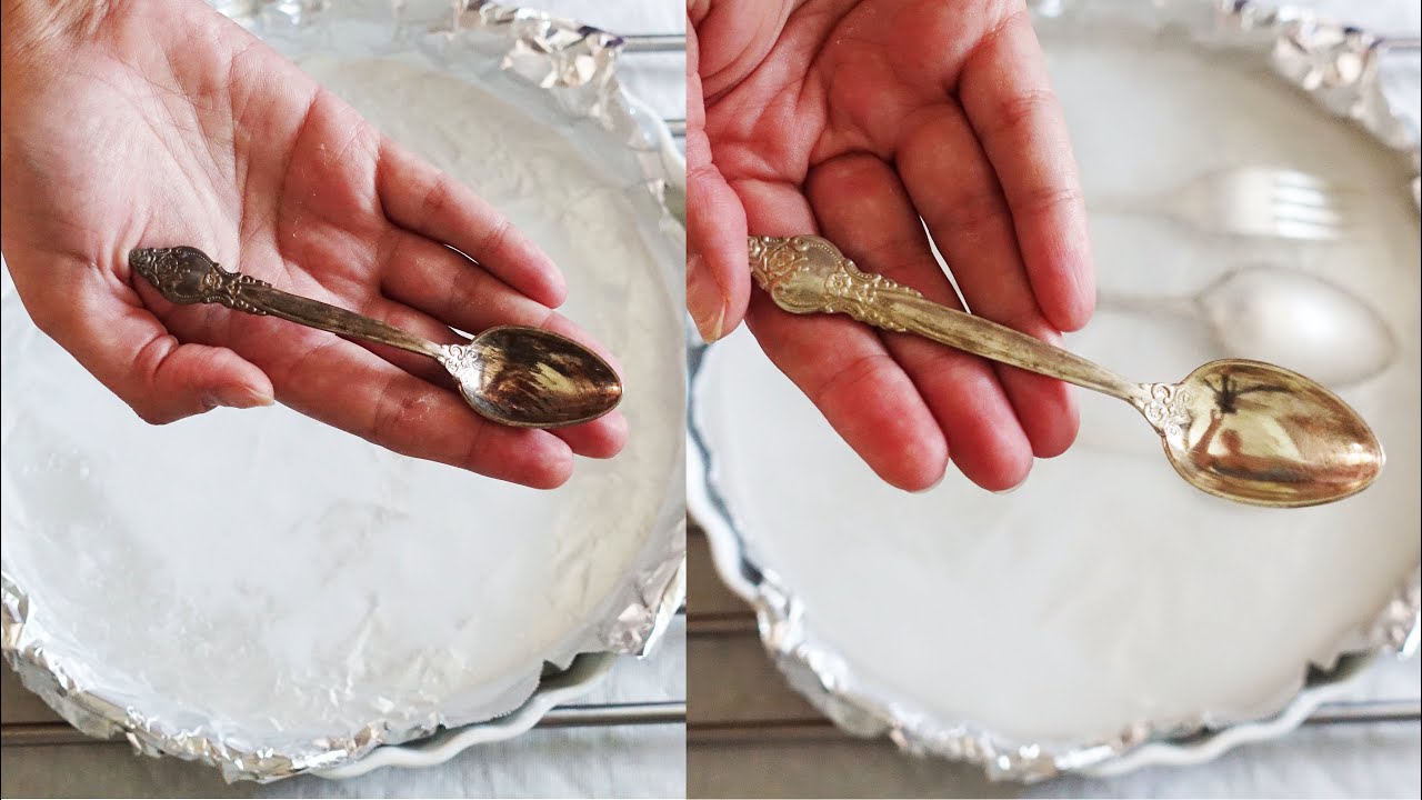 Лушпиння цибулі чи часнику кип’ятять (100 г на л води, 10 хв кипіння з ложками) — танін розчиняє наліт органічно. Оцет (9%) — 1:1 з водою, 10 хв замочування, але не для поодряпаних, бо роз’їдає. Перекис 3% з содою на фользі прискорює для важких випадків.