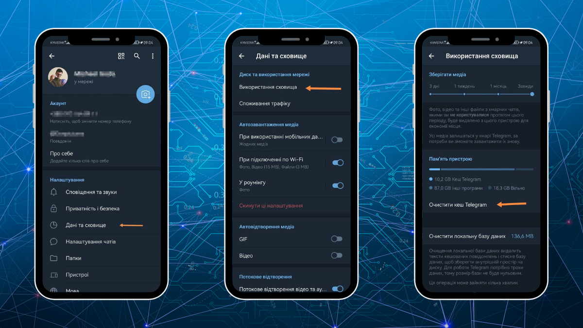 | Android | Налаштування > Дані > Використання пам’яті > Очистити | Системні додатки > Telegram > Кеш | Зберігати медіа: 1 тиждень |