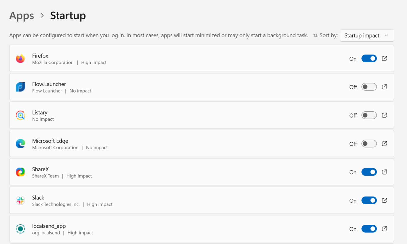Windows 10 з оновленнями 1809+ має вбудований менеджер. Win + I > “Програми” > “Автозапуск”. Список сучасних UWP-додатків і класичних exe з тумблерами. Сортуйте за “Впливом” — низький, середній, високий.