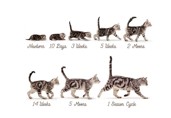 Молоді коти — суцільні м’язи та пружність. Їхнє тіло підтягнуте, ребра ледь промацуються під тонким шаром жиру, рухи швидкі, стрибки високі. Після п’яти років з’являється м’який жирок на животі — особливо у кастрованих котів, — м’язи стають менш рельєфними.