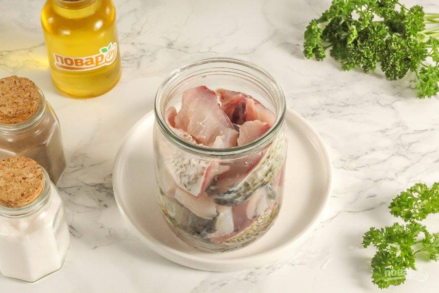 2. Пересипте шматки риби сумішшю в пластиковому контейнері чи скляній банці, щільно утрамбуйте шарами. Накрийте кришкою, поставте прес (наприклад, банку з водою) і в холодильник на 24 години.